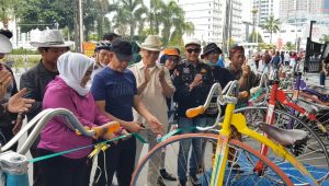 Kadispora Kota Medan Pulungan Harahap bersama Ketua KORMI Medan Adek Husein dan Asep pengusaha Sepeda Penny Farthing turut hadir sekaligus menggunting pita tanda lahirnya Penny Farthing buatan anak Medan merek AR disambut applause yang meriah dari para pengunjung Car Free Day yang tertarik melihat keunikan sepeda tersebut.
