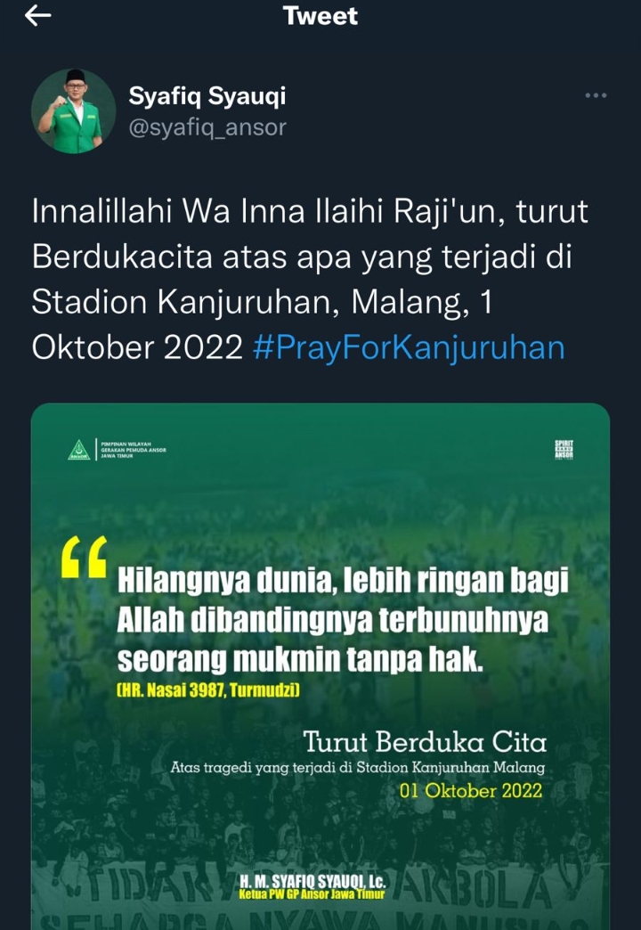 “Innalillahi Wa Inna Ilaihi Raji’un, turut Berdukacita atas apa yang terjadi di Stadion Kanjuruhan, Malang, 1 Oktober 2022 #PrayForKanjuruhan,” ucap @syafiq_ansor.