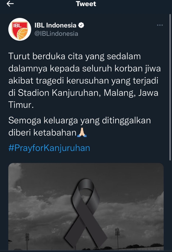 “Turut berduka cita yang sedalam dalamnya kepada seluruh korban jiwa akibat tragedi kerusuhan yang terjadi di Stadion Kanjuruhan, Malang, Jawa Timur. Semoga keluarga yang ditinggalkan diberi ketabahan. #PrayForKanjuruhan,” kata akun @IBLindonesia.