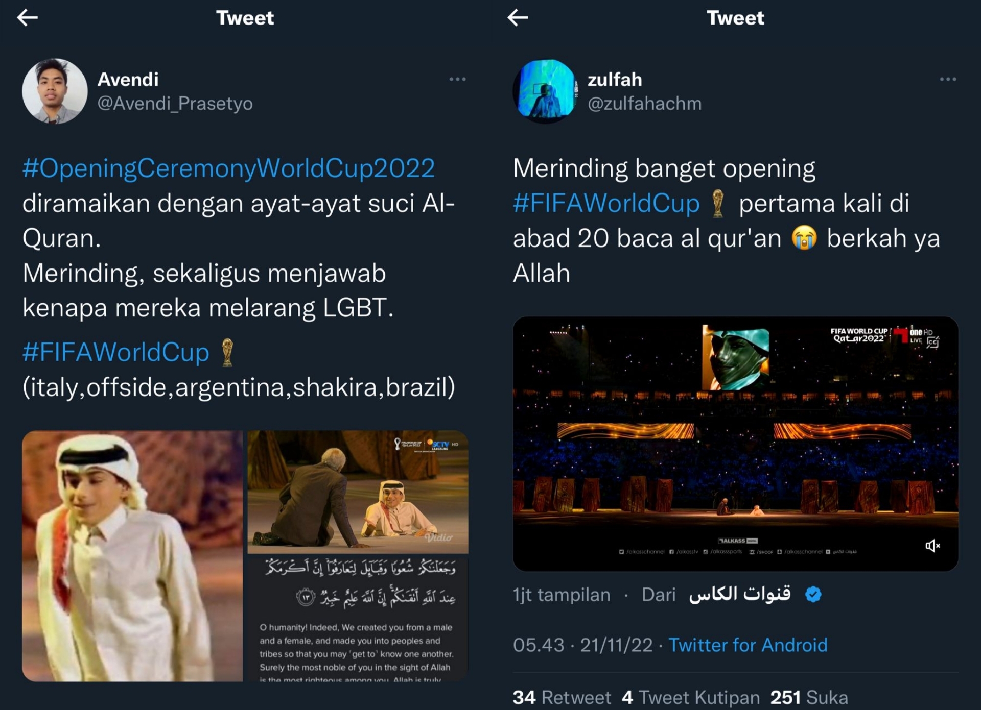 Dari pantauan redaksi Indiespot, dari tagar tersebut banyak berseliweran video pembukaan Piala Dunia yang berlangsung di Qatar tersebut. Terkhusus, saat Brand Ambassador Piala Dunia 2022 Ghanim Al Muftah masuk ke lapangan lalu melantunkan ayat suci Al Quran tepatnya Surat Al-Hujurat ayat 13.