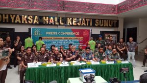 Demikian disampaikan Kajati Sumut Idianto, SH, MH didampingi Ka Otmilti Laksma TNI E Masuppey, SH,MH, Kaotmil I Medan Kolonel Laut (KH) Budi Winarno, SH,MH, Dan Pomdam I/BB Kolonel Cpm Zulkarnain, SH, Kakumdam I/BB, Aspidmil Kol. Chk. Makmur Surbakri, SH, MH, Asintel I Made Sudarmawan, SH,MH, Aspidsus Anton Delianto,SH,MH dan Kasi Penkum Kejati Sumut Yos A Tarigan,SH, MH kepada wartawan dalam kegiatan Press Conference di Kantor Kejati Sumut Jalan AH Nasution Medan, Selasa (10/10/2023).