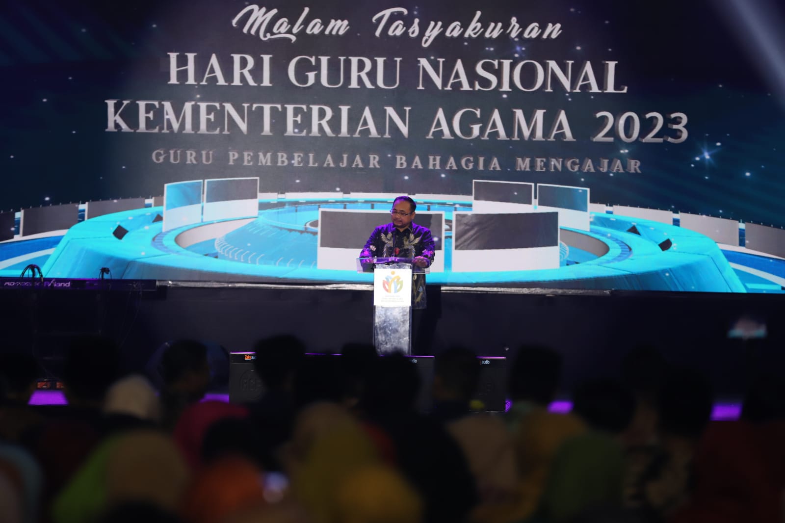 HGN tahun 2023 mengusung tema ‘Guru Pembelajar Bahagia Mengajar’. Hadir, Dirjen Pendidikan Islam, M Ali Ramdhani, staff khusus, staff ahli dan tenaga Ahli Menteri Agama, jajaran pejabat Ditjen Pendis, para Kakanwil se Indonesia, dan pejabat eselon I, II, Kemenag RI, serta ribuan guru se Indonesia.