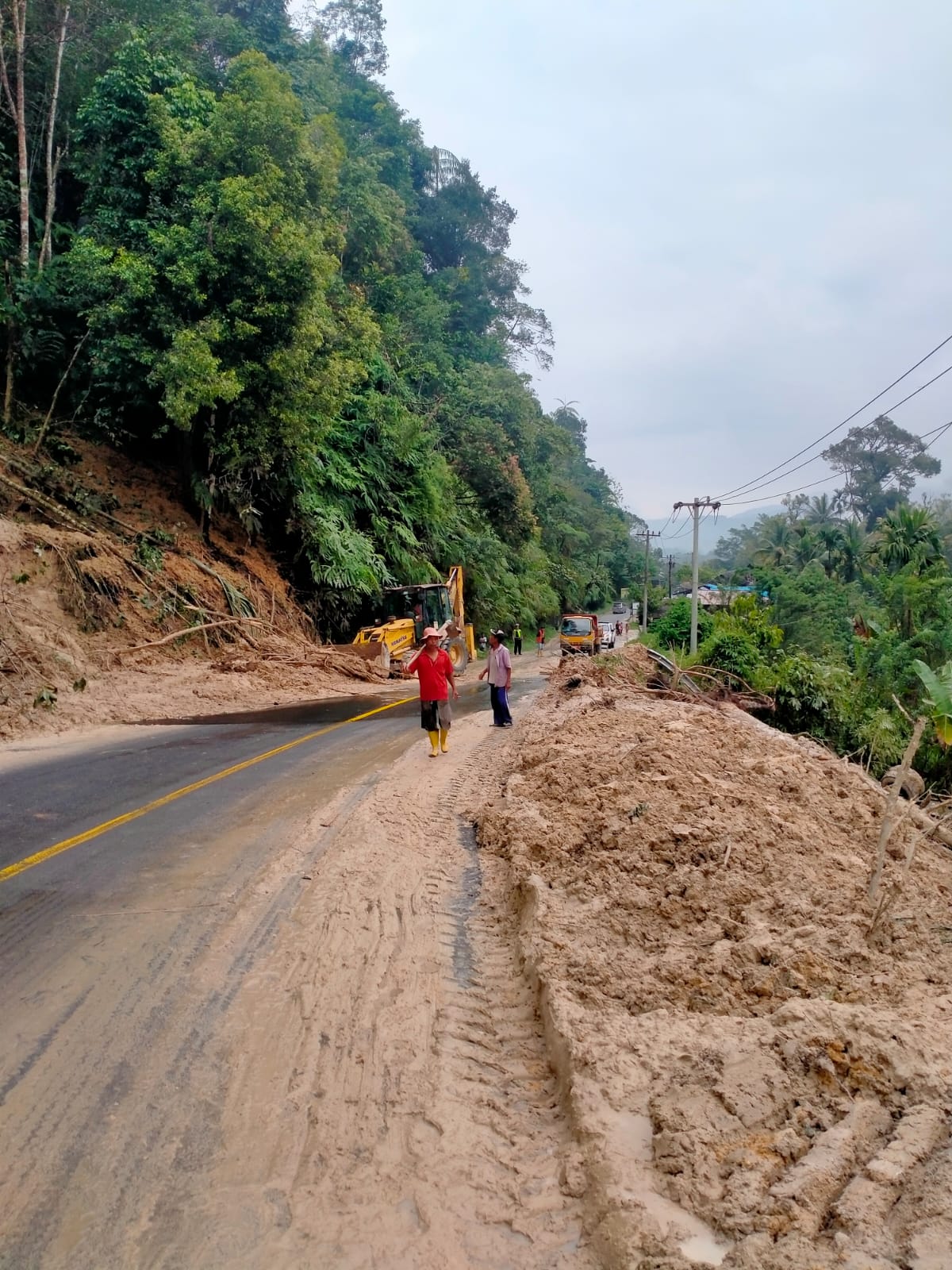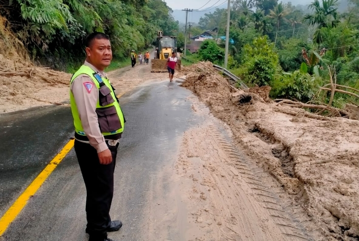 Tanah longsor itu juga turut membawa kayu besar tumbang dan menutup ruas jalan tersebut.