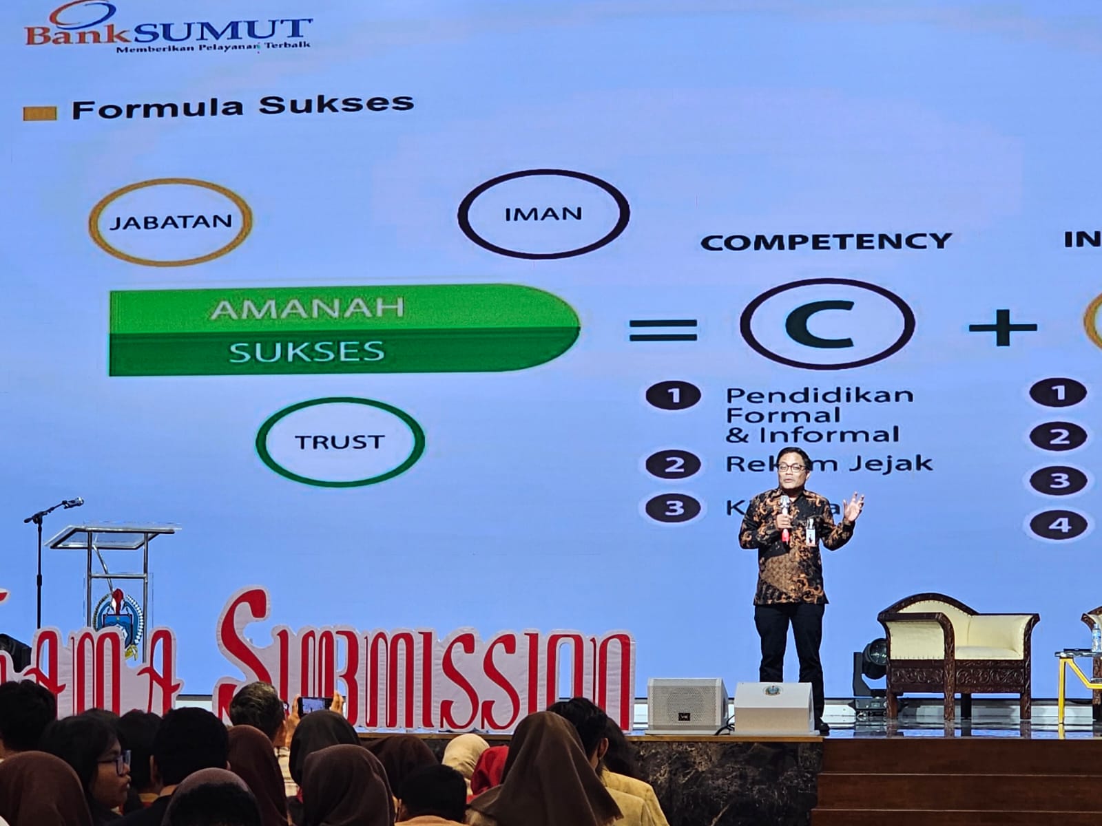 INDIESPOT.ID, Medan – Dirut Bank Sumut Babay Parid Wazdi menjelaskan ada beberapa kualifikasi yang dibutuhkan seseorang untuk sukses atau bahkan menjadi Pemimpin Masa Depan, menurut Babay Parid Wazdi menjadi sukses tidak hanya diukur dari kualifikasi pendidilan formal atau kompetensi yang dimiliki namun juga hubungan baik yang dijalin serta menghindari self interest pada diri sendiri