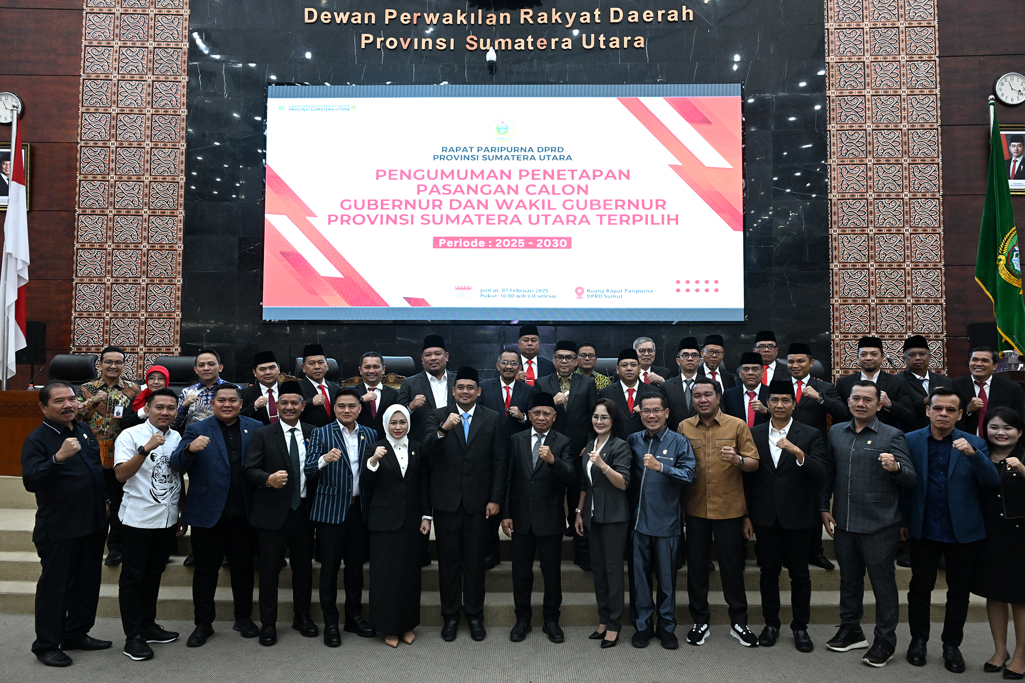 INDIESPOT,CO.ID MEDAN – Rapat Paripurna DPRD Provinsi Sumatera Utara (Sumut) yang dipimpin Ketua DPRD Sumut Erni Ariyanti mengumumkan dan menetapkan Pasangan Calon (Paslon) M Bobby Afif Nasution Bobby – Surya sebagai Gubernur dan Wakil Gubernur (Wagub) terpilih Provinsi Sumut hasil Pemilihan Kepala Daerah (Pilkada) 2024. Rapat tersebut berlangsung di Ruang Paripurna Kanto DPRD Sumut, Medan, Sumut, Jumat, (7/2/2025).